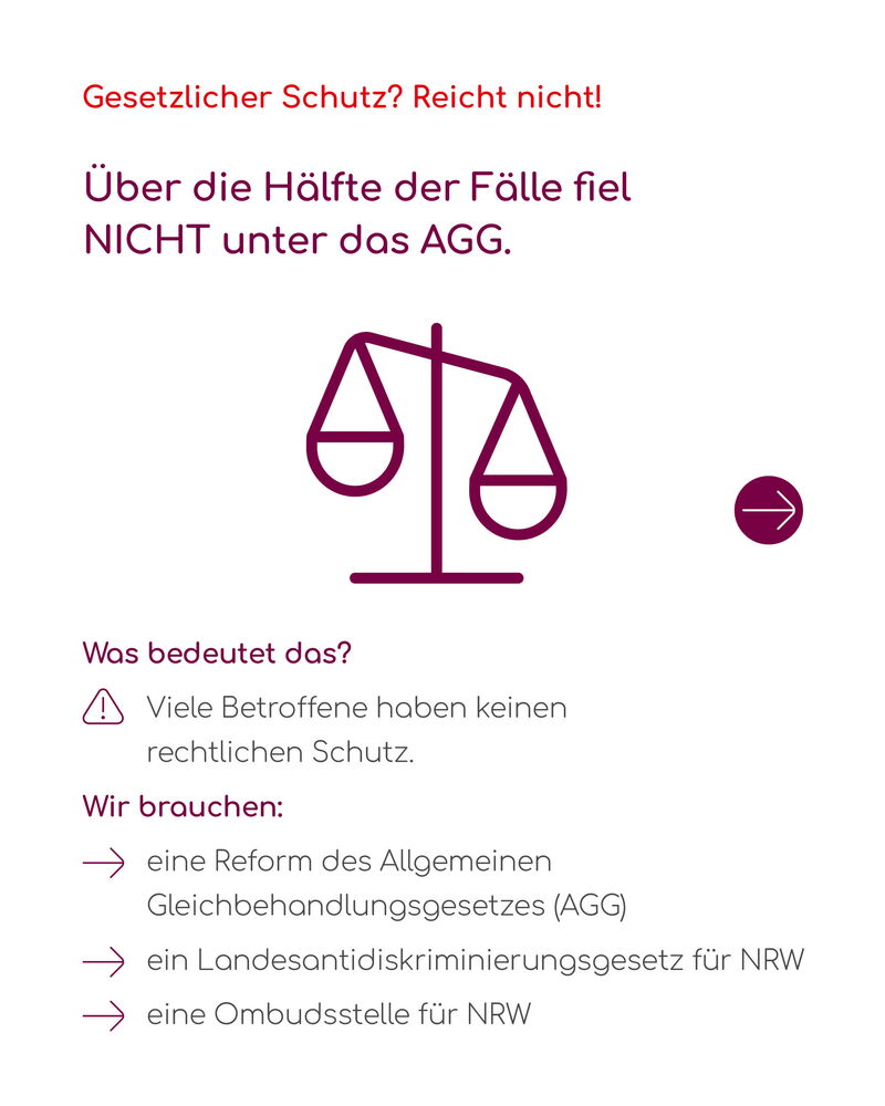 Überdies zeigen die Zahlen: Mehr als die Hälfte aller dokumentierten Fälle fielen nicht in den Schutzbereich des Allgemeinen Gleichbehandlungsgesetzes (AGG). Besonders betroffen sind Menschen, die Diskriminierung im Bildungsbereich oder durch Behörden erleben – Bereiche, die bislang kaum rechtlich geschützt sind, weil sie vom AGG nicht abgedeckt werden.