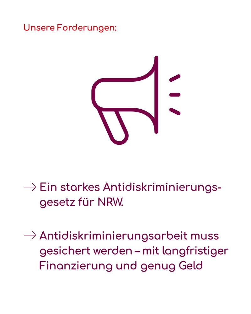 - die Verabschiedung eines starken Landesantidiskriminierungsgesetzes für NRW, das insbesondere Diskriminierung durch staatliche Stellen erfasst und