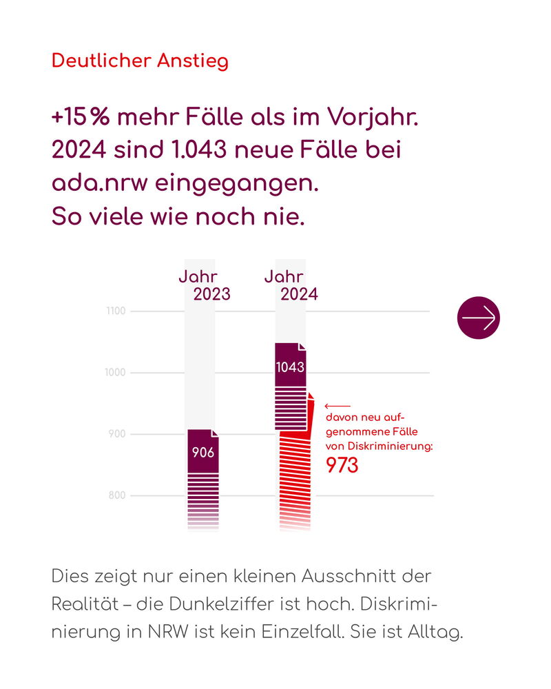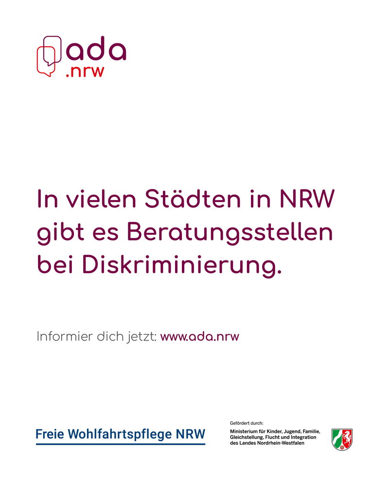 „Diskriminierung betrifft den Alltag vieler Menschen in NRW. Viele wollen sich Diskriminierung nicht einfach gefallen lassen und haben sich an unsere Beratung gewendet. Wenn Diskriminierung von den Verantwortlichen nicht ernst genommen wird, kommen wir aber nicht weiter. Der Jahresbericht zeigt: Wir brauchen bessere Strukturen, wirksame Gesetze und eine klare Haltung gegen jede Form von Diskriminierung“, betont Mira Berlin, Projektleitung Dokumentation und Berichtswesen im Netzwerk ada.nrw.
