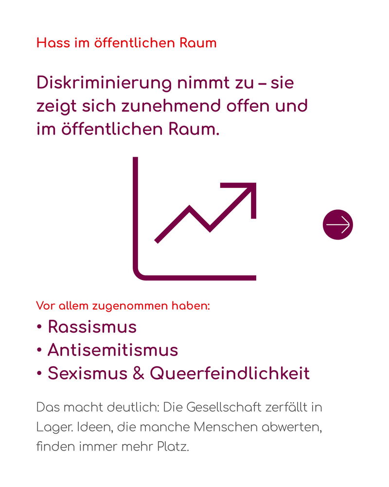 Dabei fällt auf, dass immer mehr Fälle sich in der Öffentlichkeit ereignen. Rassismus, Antisemitismus, Sexismus und Queerfeindlichkeit manifestierten sich dort besonders häufig – teils offen verbal oder körperlich. Die Zahlen machen deutlich, dass die Gesellschaft in Lager zerfällt. Ideen, die manche Menschen abwerten, finden immer mehr Platz.