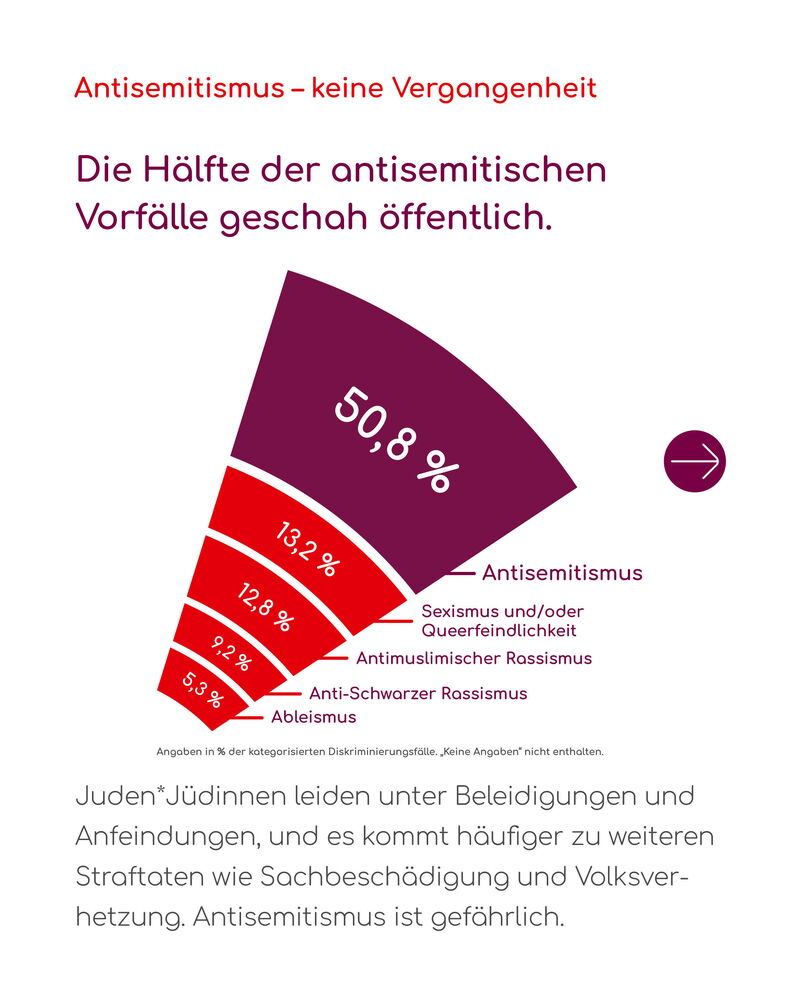 Auch Antisemitismus nahm 2024 deutlich im Vergleich zum Vorjahr zu und machte 6,8 Prozent aller dokumentierten Fälle aus - ein großer Anteil, bedenkt man die Größe der betroffenen Community. Seit dem Terrorangriff der Hamas auf die israelische Bevölkerung am 7. Oktober 2023 und dem anschließenden Gaza-Krieg zeigt sich Antisemitismus anhaltend offener. Juden*Jüdinnen litten unter Beleidigungen, Anfeindungen und es kam häufiger zu antisemitischen Straftaten.