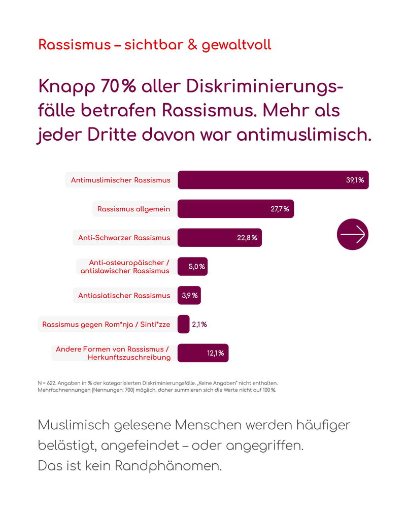 Rassismus bleibt mit knapp 70 Prozent die häufigste Diskriminierungsform. Besonders häufig traten dabei Antimuslimischer Rassismus (39,1 Prozent) und Anti-Schwarzer Rassismus (22,8 Prozent) auf.